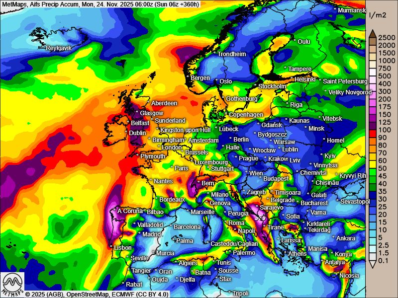 Akkumulierte Regenmengen bis 24.11. nach AIFS