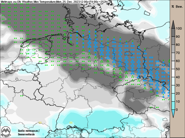 Die Karte zeigt die Berechnung (Lufttemperatur, Bewölkungsgrad, Niederschlagsform) des US-amerikanischen GFS-Modells für den 25.12.2023 (12:00 Uhr).