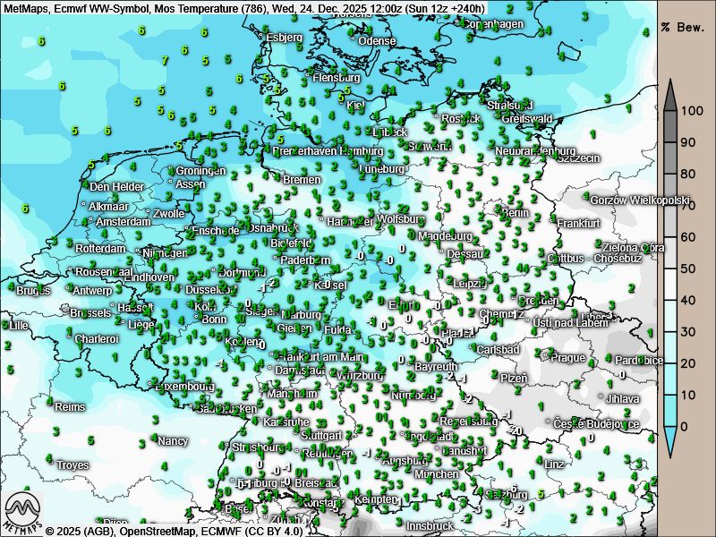Allerdings geht die ruhige Wetterlage mit einer allmählichen Abkühlung einher: In den Nächten sinken die Temperaturen in Richtung Gefrierpunkt, örtlich gibt es leichten Frost. Tagsüber erreichen die Temperaturen über die Weihnachtstage meist Höchstwerte zwischen 5 und 7 Grad.