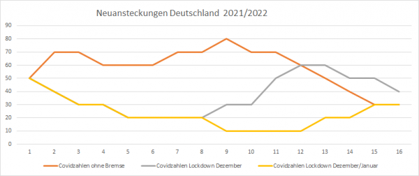 Die Graphen zeigen den möglichen Verlauf der Neuansteckungen in den kommenden 12 Wochen - zum einen komplett ohne Lockdownmaßnahmen (rot), mit einem Dezember-Lockdownn (gelb) sowie einem Lockdown im Dezember und Januar.