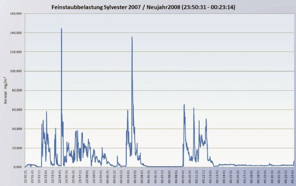 Wir haben solche hohen Werte noch nie zuvor erlebt. Diese Konzentrationen schlagen alle bisherigen Rekordwerte um ein Vielfaches. Im Vergleich zu der Silvesternacht war die Luft in den verrauchten Bonner Szenekneipen, in denen wir bis zu 4.000 Mikrogramm gemessen hatten, regelrecht wohltuend. Selbst in den Raucherzimmern von Großraumbüros war es mit 10.000 Mikrogramm angenehmer als in den Feuerwerksschwaden.