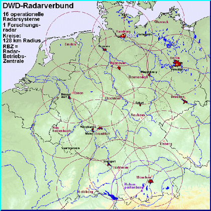 Da das Wetterradar aufgrund der Krümmung der Erde und verschiedener anderer Faktoren nur eine begrenzte Reichweite hat, muss ein Bild, das ganz Deutschland umfassen soll, aus den Bildern mehrerer Radarstationen zusammengesetzt werden. In Deutschland sind dies 16 Stationen des Deutschen Wetterdienstes, die über ganz Deutschland verteilt stehen: